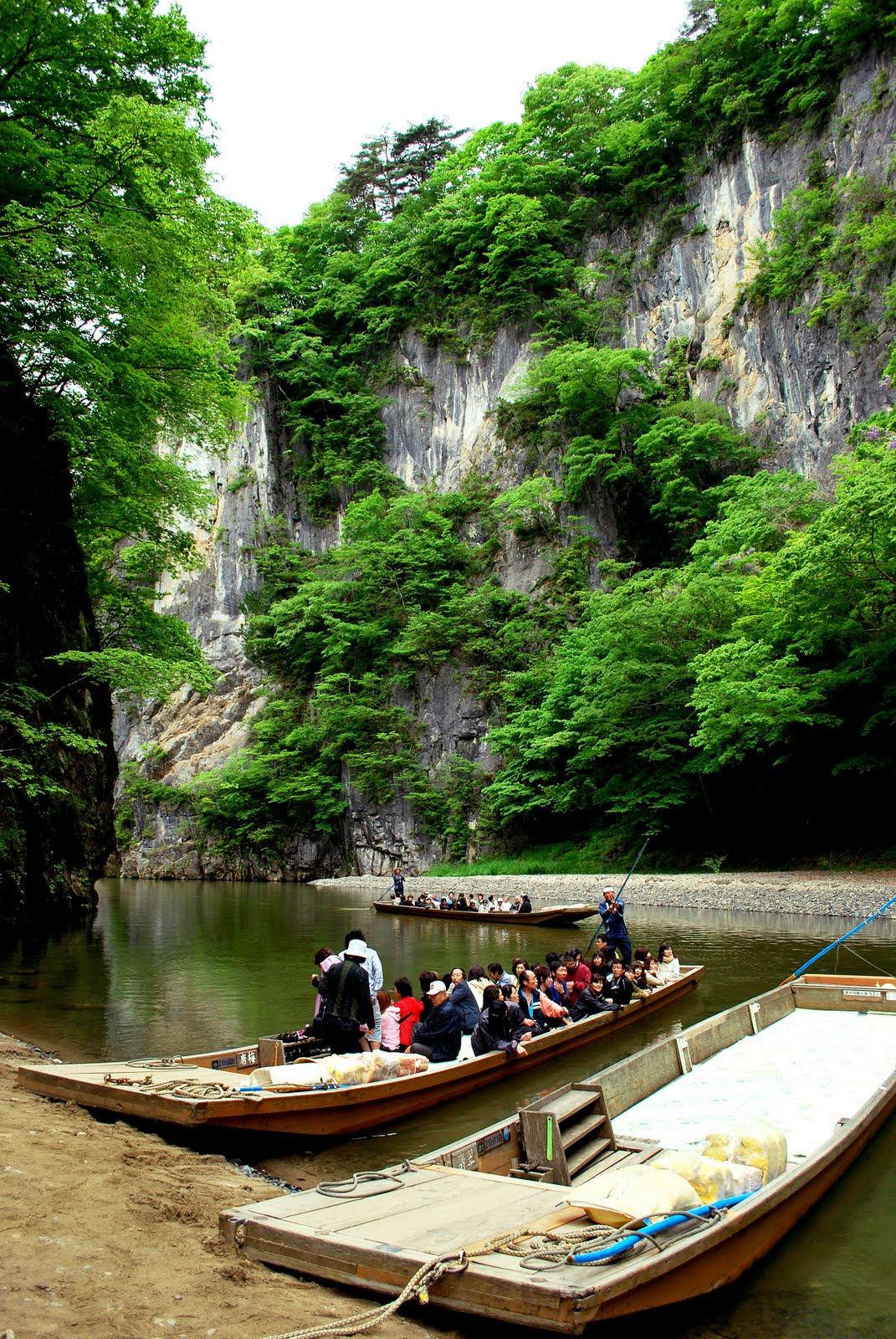 "Geibi Gorge, where fantastically-shaped rock formations tower high above, and the lush greenery celebrates the glory of the seasons. Numbered one of the most picturesque spots in Japan, this beautiful gorge was carved from strata of limestone by the Satetsu River."